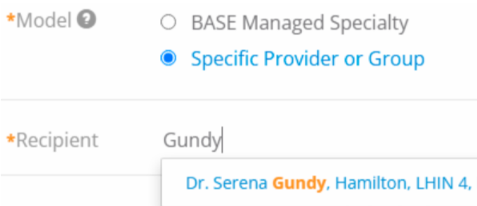 To send Dr. Gundy an eConsult, select Specific Provider or Group, and search for her name in the Recipient field, as shown here: | | |