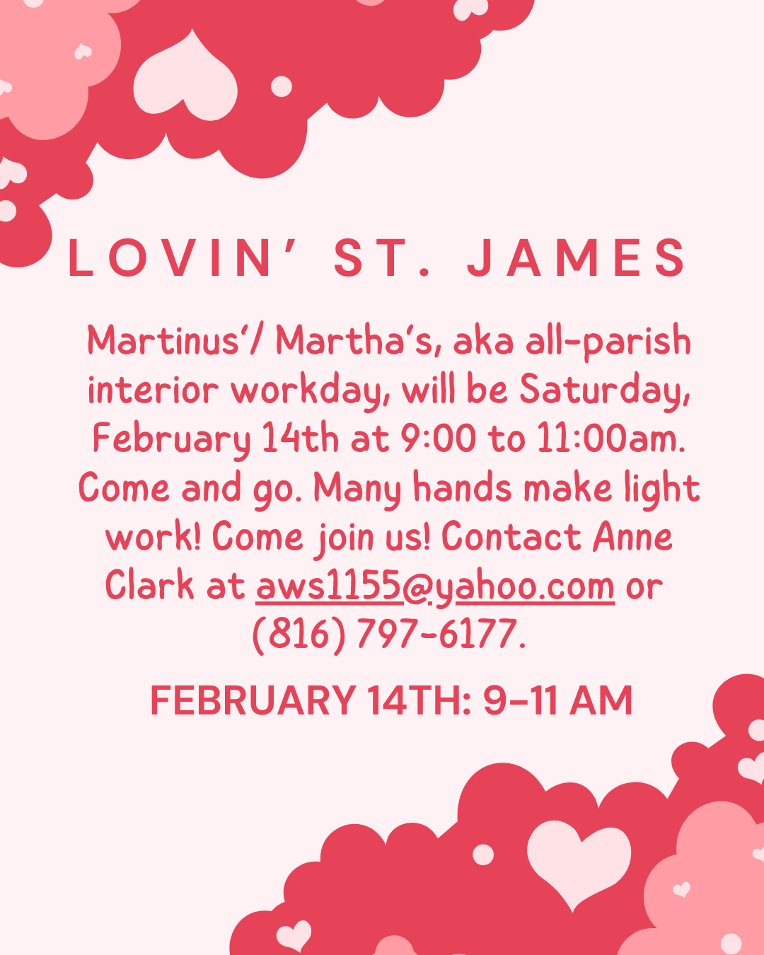 If your prayers have been answered, let us rejoice with you. Please contact the office to let us know we can remove your prayer request. If you have prayers you would like added to the prayer list, please contact the office at office@stjameswichita.org or 316-683-5686