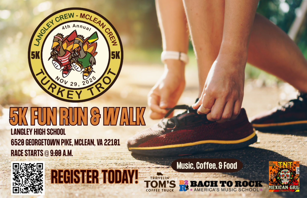 Lace up and get your "crew" together and join the Langley and McLean Crew teams for the 4th Annual Turkey Trot on Sat, Nov 29. This fun, family-friendly race raises funds for both the Langley Crew and Mclean Crew Clubs. Every registration helps student-athletes stay on the water and rowing strong! Join us after the race for music, food and coffee trucks, a bake sale, and winter greenery sale.