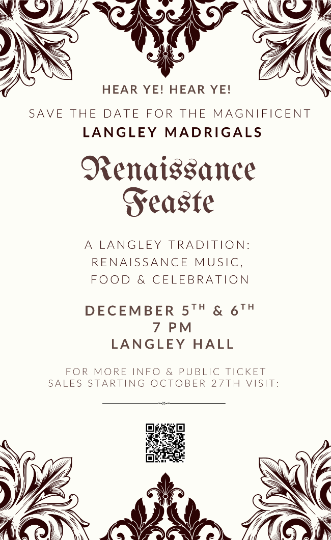 Come join the Langley Choir for a huge dinner theater experience on Fri, Dec 5 and Sat, Dec 6 at 7 pm. There are hundreds of decorations around Langley Hall, Renaissance costumes, memorized scripts, some dancing, a catered meal, and of course singing!
