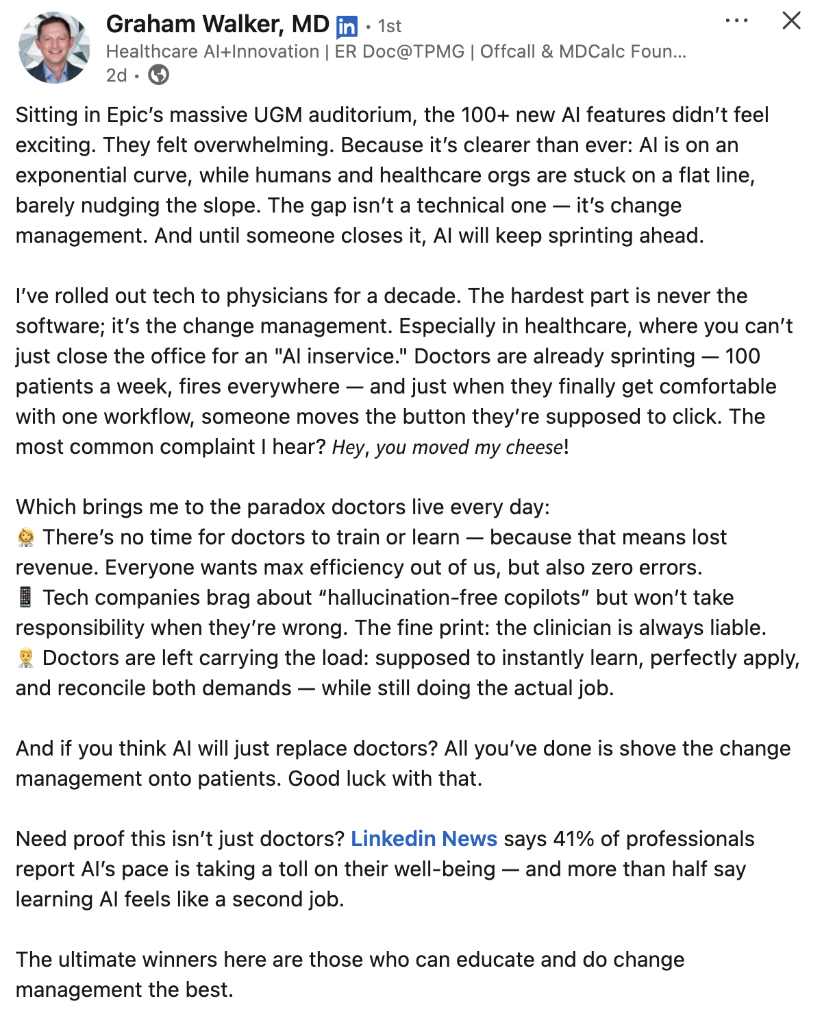 | | Edwina Bhaskaran, Chief Clinical Systems and Informatics Officer, Mayo Clinic, argues that flawless workflows fail without cultural readiness, learning tools, and outcomes. Drawing on a transplant-unit rollout, she notes users resisted until leaders explained the why, educators built confidence, and communicators tied changes to real-world impact. Bhaskaran frames adoption as STICKY’s back half—Culture, Knowledge, Yield: anticipate resistance, demand actionable data from vendors to evolve systems, and prove time saved. When yield lags, rethink or retire. | | | |