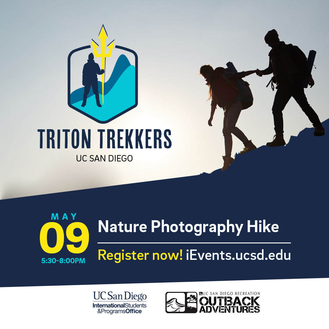 Join this group adventure during the golden hour and bring your camera (or your phone)! Explore the nature on campus and try your hand at taking compelling photos in our own backyard. Triton Trekkers is a collaboration between ISPO and Outback Adventures at UCSD.