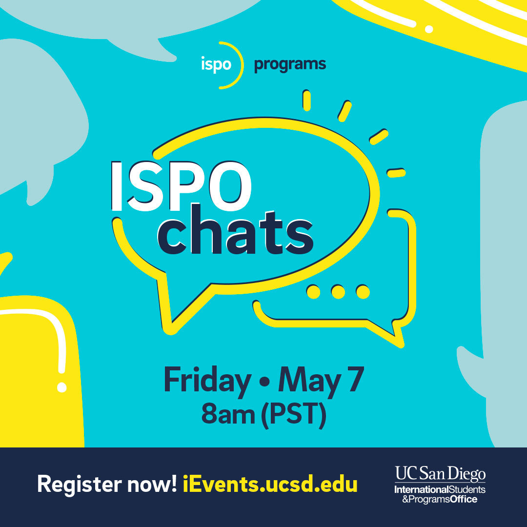 Think of ISPO Chats as your monthly office hour with the ISPO Leadership team. ISPO deeply values the student voice and we want to hear from you. What is affecting you as an international student at UC San Diego? What would you like to learn more about? Do you have questions about policy updates, current events, etc.? ISPO Chats is an informal time for you to share about your experience as an international student at UC San Diego as well as questions to ISPO staff. We hope that by hosting these monthly office hours, we can hear your concerns, advocate on your behalf and invest in our international student community.