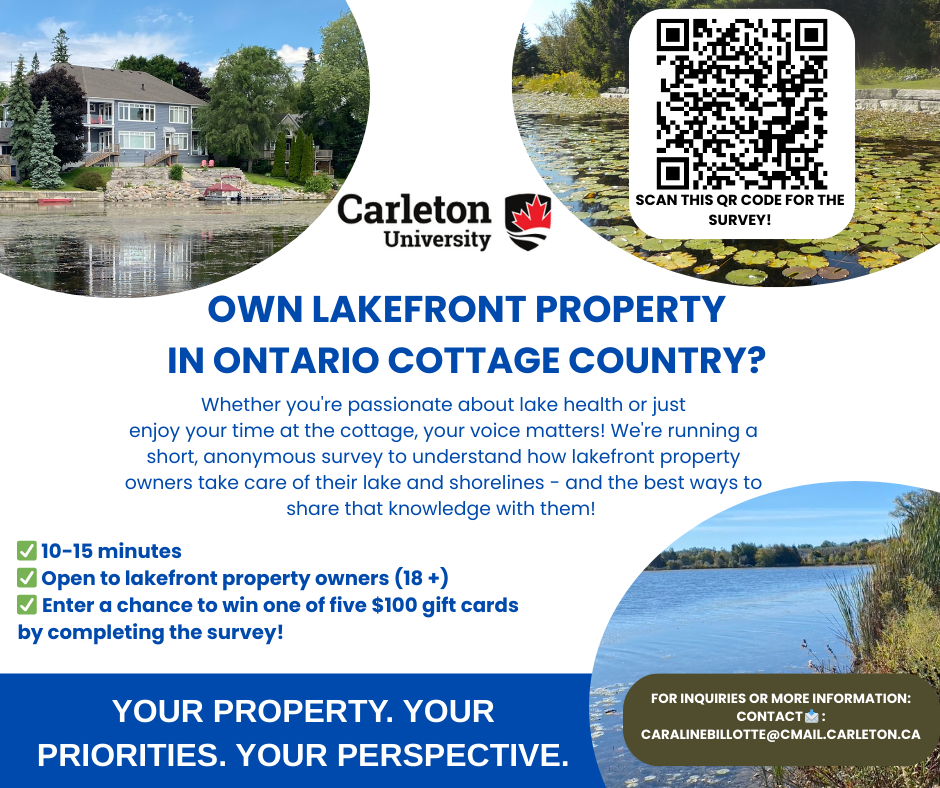 Our colleagues at Carleton University invite all FOCA members to participate in a short survey being undertaken by a graduate student researching lake stewardship and shoreline care. The survey is anonymous and open to anyone age 18+ who owns lakefront property. Feel free to share the survey link widely.