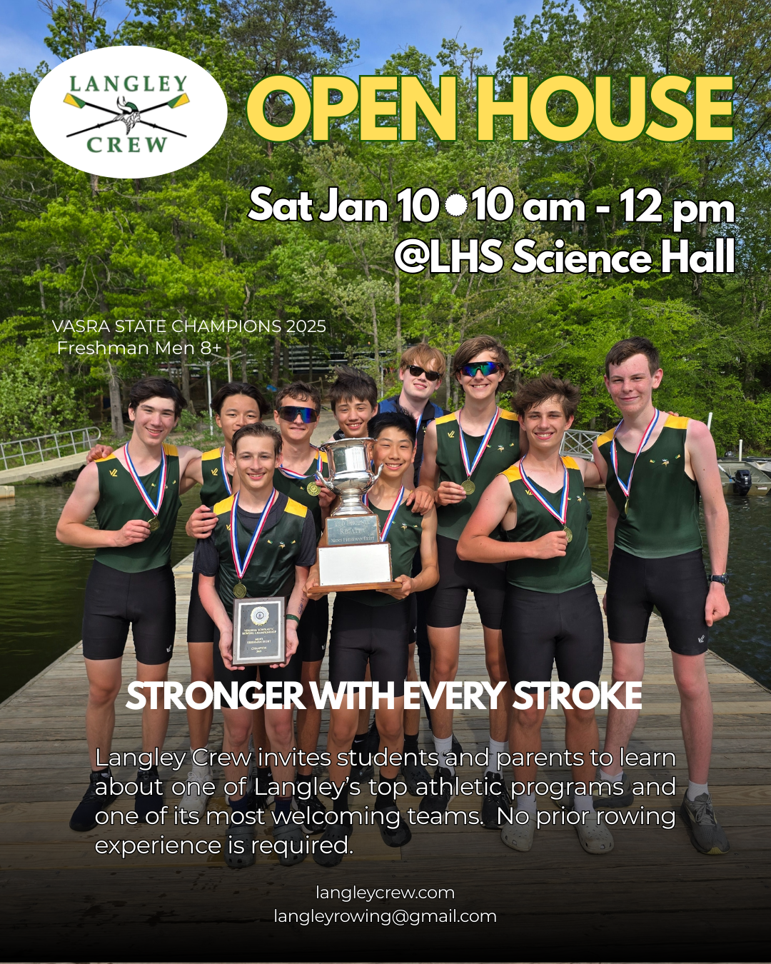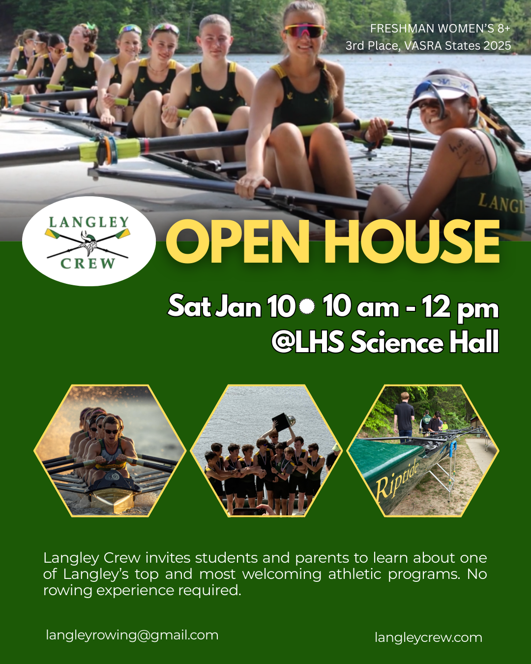 The Langley Crew Team will host an Open House this Sat, Jan 10 from 10 am - 12 pm at Langley Science Hallway. Come meet the coaches, learn about the team and sport and try out an erg!