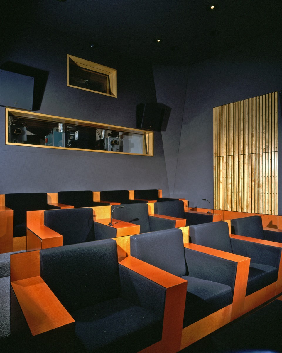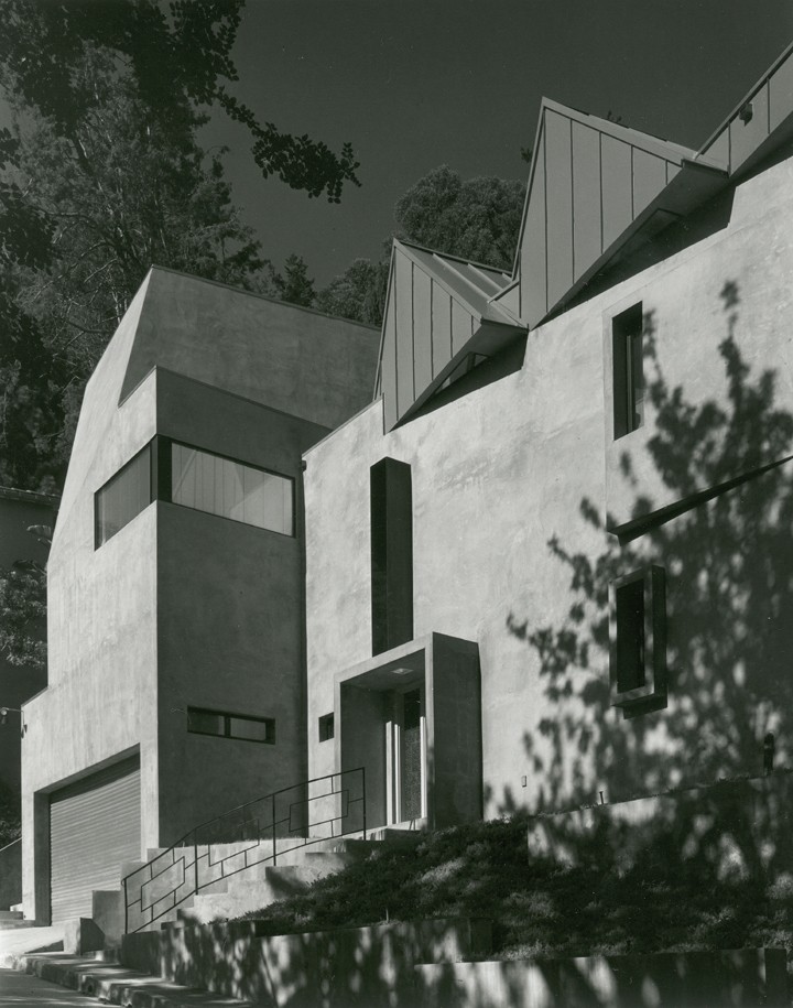 The facility includes a movie screening room and a painting and drawing studio. A small office on the lower floor, a kitchen and an outdoor patio above the roof level were also added. The two main spaces can be seen as opposite extremes within a common shell. While the painting studio needs natural and diffused light, the screening room requires complete darkness. The openness of the painting space contrasts with the absolute enclosure of the recording studio and screening room. "The typically Californian dissolution of the boundaries between inside and outside is confronted by the secluded dreamworld of a virtual reality. The exterior of the building reflects the duality of the inside but mediates between the two different aspects to create a dynamic, if tense, equilibrium," says the designer Grueneisen.