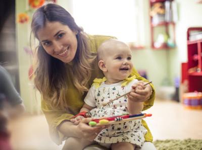 Image: A mum with her baby playing the tambourine.